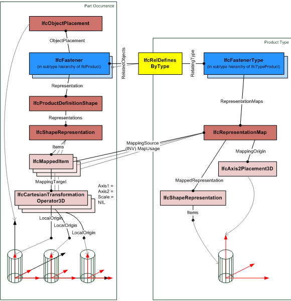 Any IfcElement (so far no further constraints are defined at the level of its subtypes) may be represented using the 'MappedRepresentation'. This shall be supported as it allows for reusing the geometry definition of a type at all occurrences of the same type. The results are more compact data sets. The same constraints, as given for 'SurfaceOrSolidModel', 'SurfaceModel', 'Tessellation', 'Brep', and 'AdvancedBrep' geometric representation, shall apply to the IfcRepresentationMap. |